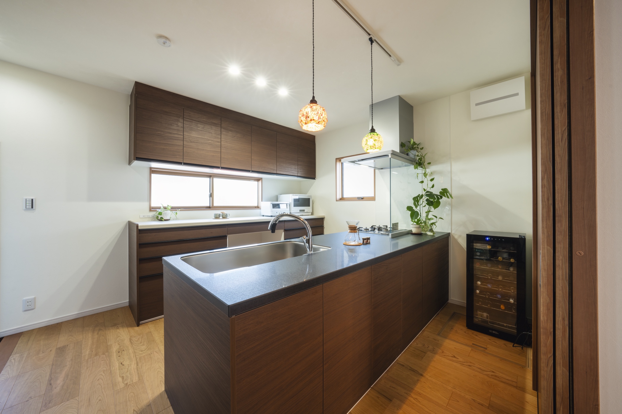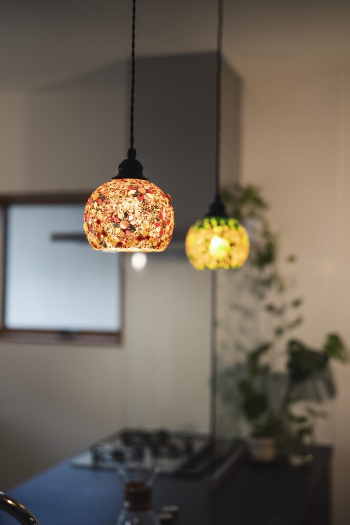 キッチンのペンダントライトには、お施主様お手製のライトを取り付けたいとのご要望をいただき、ライトの個数を調整できるようにダクトレールを取り付けました。
