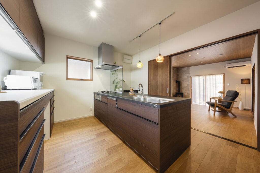 キッチンとリビングの間はつながりを持たせるために2枚引きの建具を入れ、通常時は開け放ち来客時は空間を仕切れるようにしました。