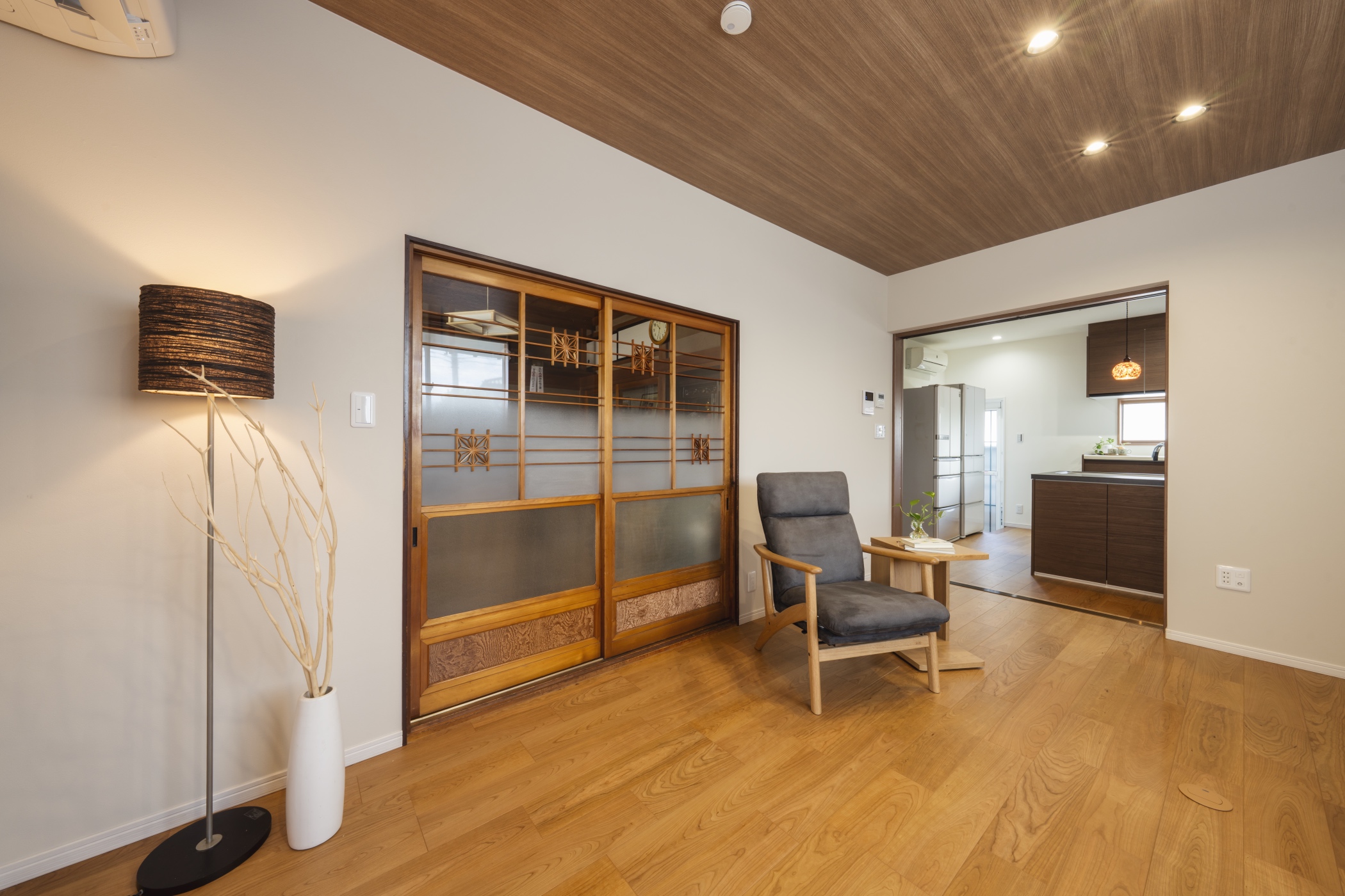 お施主様より思い出の詰まった茶の間は今までのまま使用したいとのご希望があり、リビングと茶の間をつなぐ組子入りのガラス戸はきれいに洗って再利用しました。