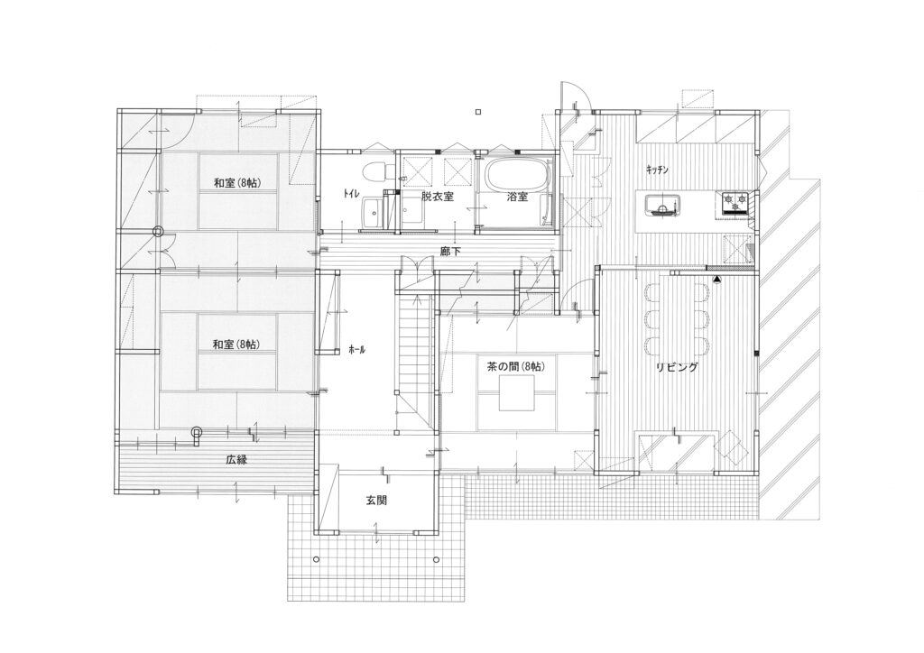 お施主様より思い出の詰まった茶の間は今までのまま使用したいとのご希望があり、リビングと茶の間をつなぐ組子入りのガラス戸はきれいに洗って再利用しました。